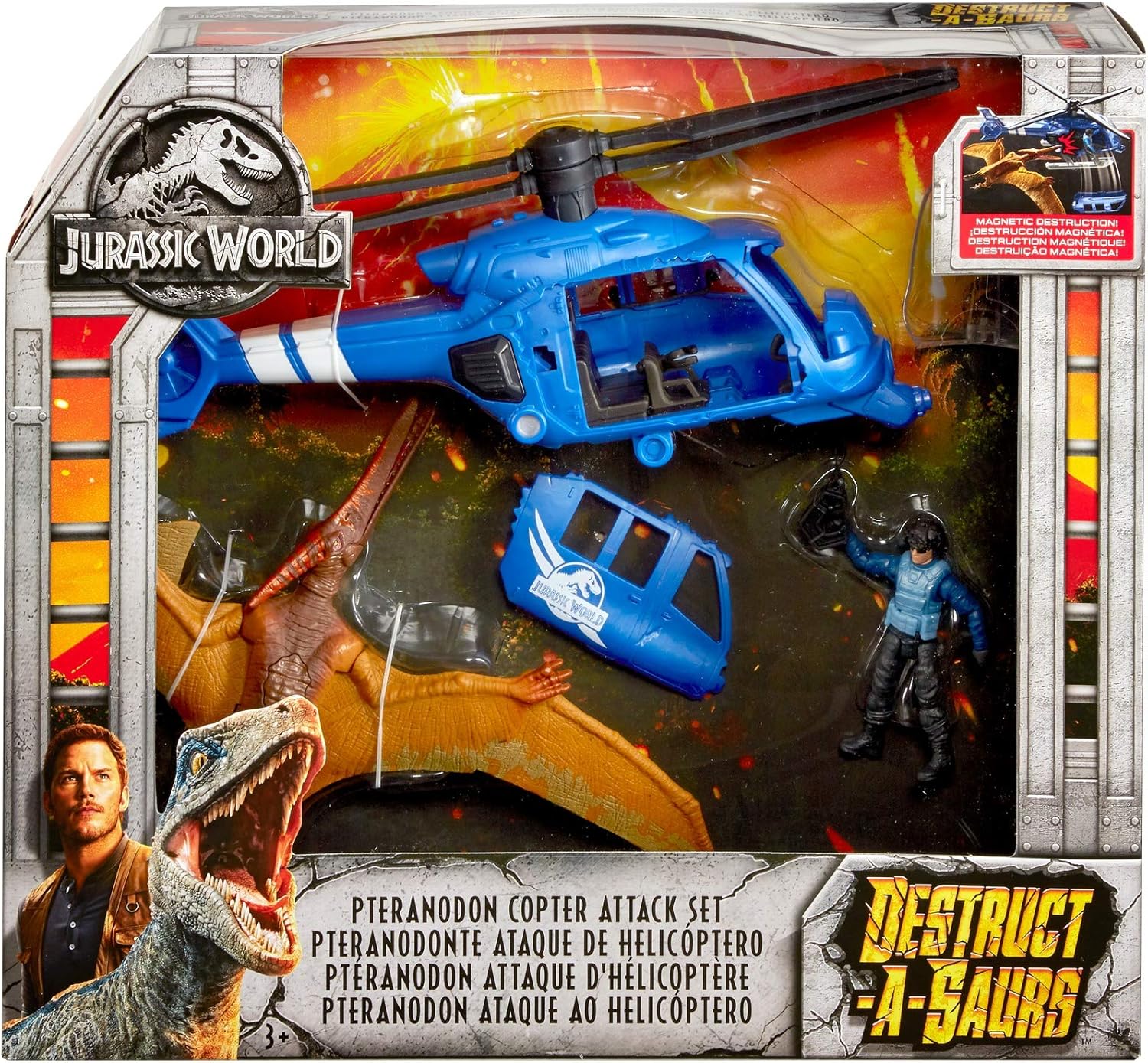 Get ready for thrilling action and adventure with Jurassic World! Play out all the exciting high-flying scenes in the film with the Jurassic World Destruct-a-saurs Pteranodon Copter Attack set! This exciting playset includes the characters and accessories needed for film-real flight scenes: a helicopter vehicle, Pteranodon dinosaur action figure and pilot action figure. With its beak, the Pteranodon triggers magnetic destruction on the helicopter – and when this happens, watch pieces of the aircraft go flying! This is one high-flying destructive dinosaur on the attack! Watch out! Colors and decorations may vary.