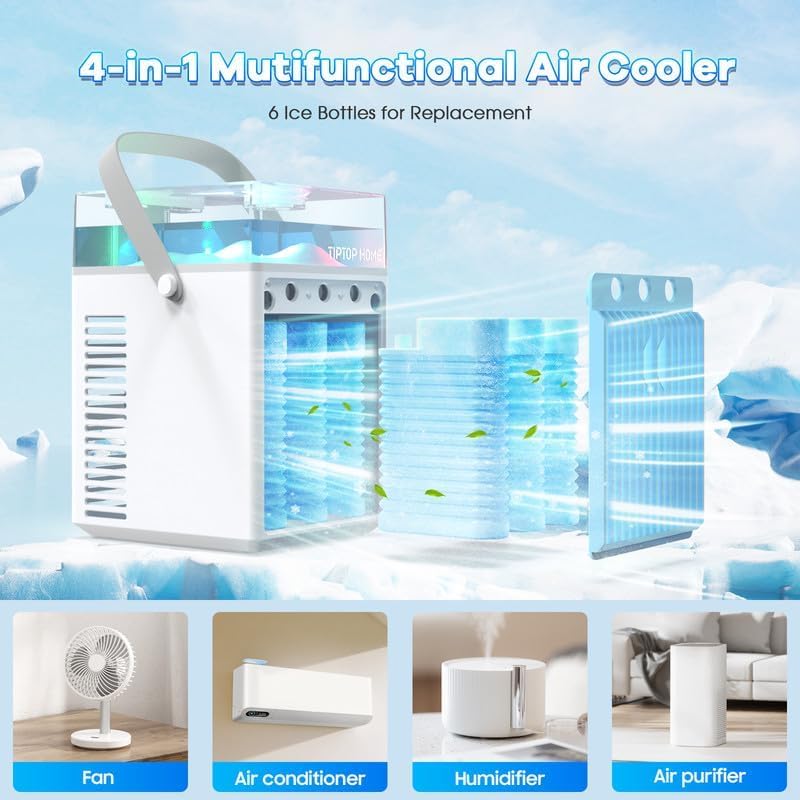4in1 Portable Air Conditioner Fan features cooling,humidifying, lighting functions. Let it serve you a cooler summer.Features of Thehomeuse Mini Air Cooler :1. Safe design. The portable ac unit will turn off automaticly after 6hrs.2. Strong wind. The highest level wind can cover a big space and creat a cooling zone for you.3. Quiet. The evaporative cooler is quiet during runing. You can use it during sleeping without disturbing.4. Low electric consumption. The evaporative cooler has rated power 10W, you can enjoy a cooler summer with low electricity bill.5. 800ml water tank. Large water tank allows the evaporative cooler cooling for a long time. You don't need to add water every 30mins.6. LED lights. The LED lights has 7 color, they are soft and and wonderful for your night. You can also turn off the lights.7. 2000mah Battery. The rechargeable design ensure you can take the mini air conditioner fan anywhere you want. It's a great choice for summer camping.8. Type C port. The Type C charging port allows higher electric efficiency. The charging can be faster.Specifications:Power Supply: USB RechargableWater Tank Capacity: 800mlWinds Speed: 3 modesHumidification: 3 Mist LevelsProduct size: 9*5.5*6.5inchProduct Weight: 2lbPackage List:1 x Personal Air Conditioner Fan1 x USB Cable1 x User ManualNote:1. Please kindly note that this is a personal air conditioner fan, it won't able to cool a whole room. Keep it near by your side is the correct using way.2. If the water tank is short of water, pls turn off the mist function or add water in case break the mini ac unit.3. We suggest clean the water tank once a week to clear scale.