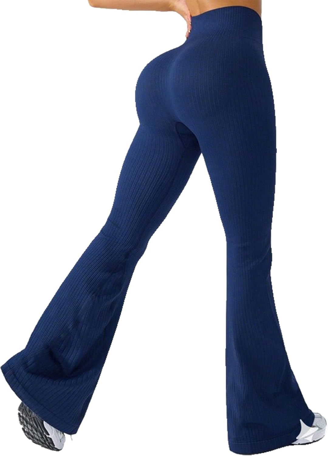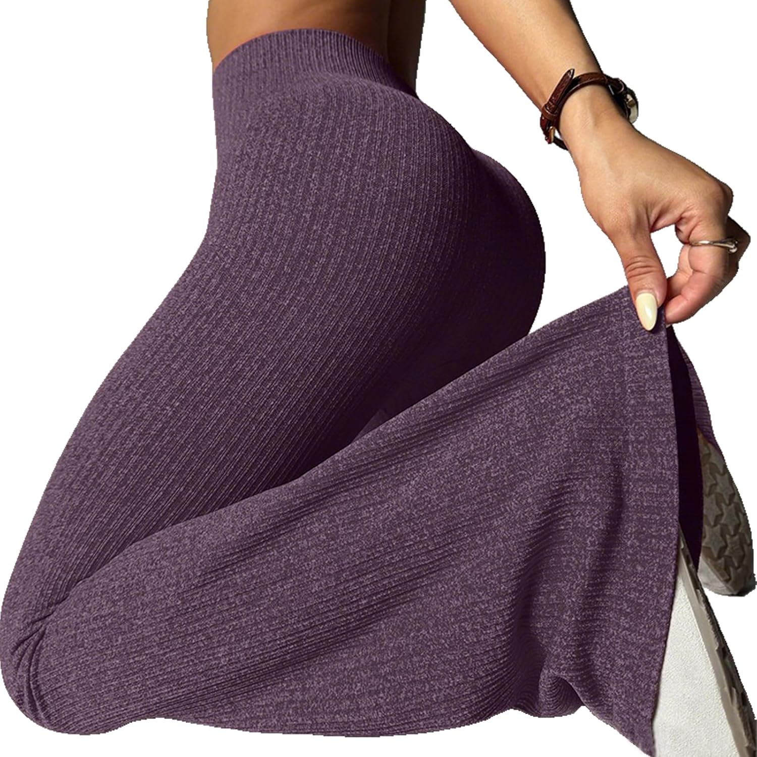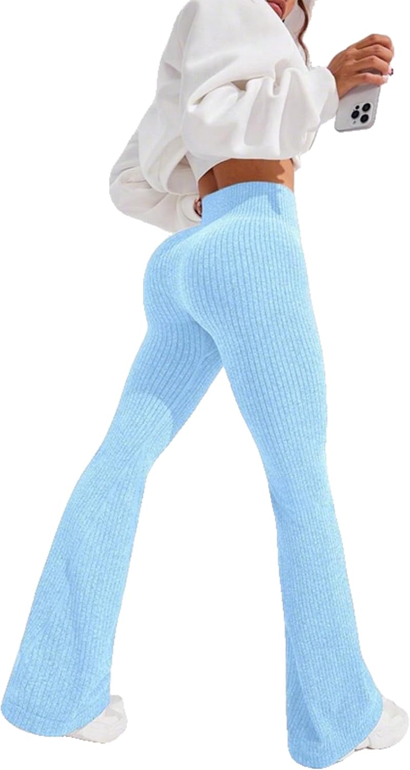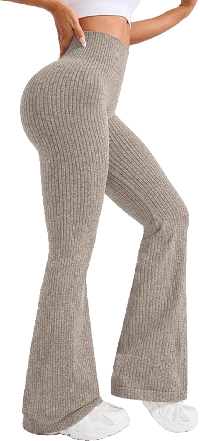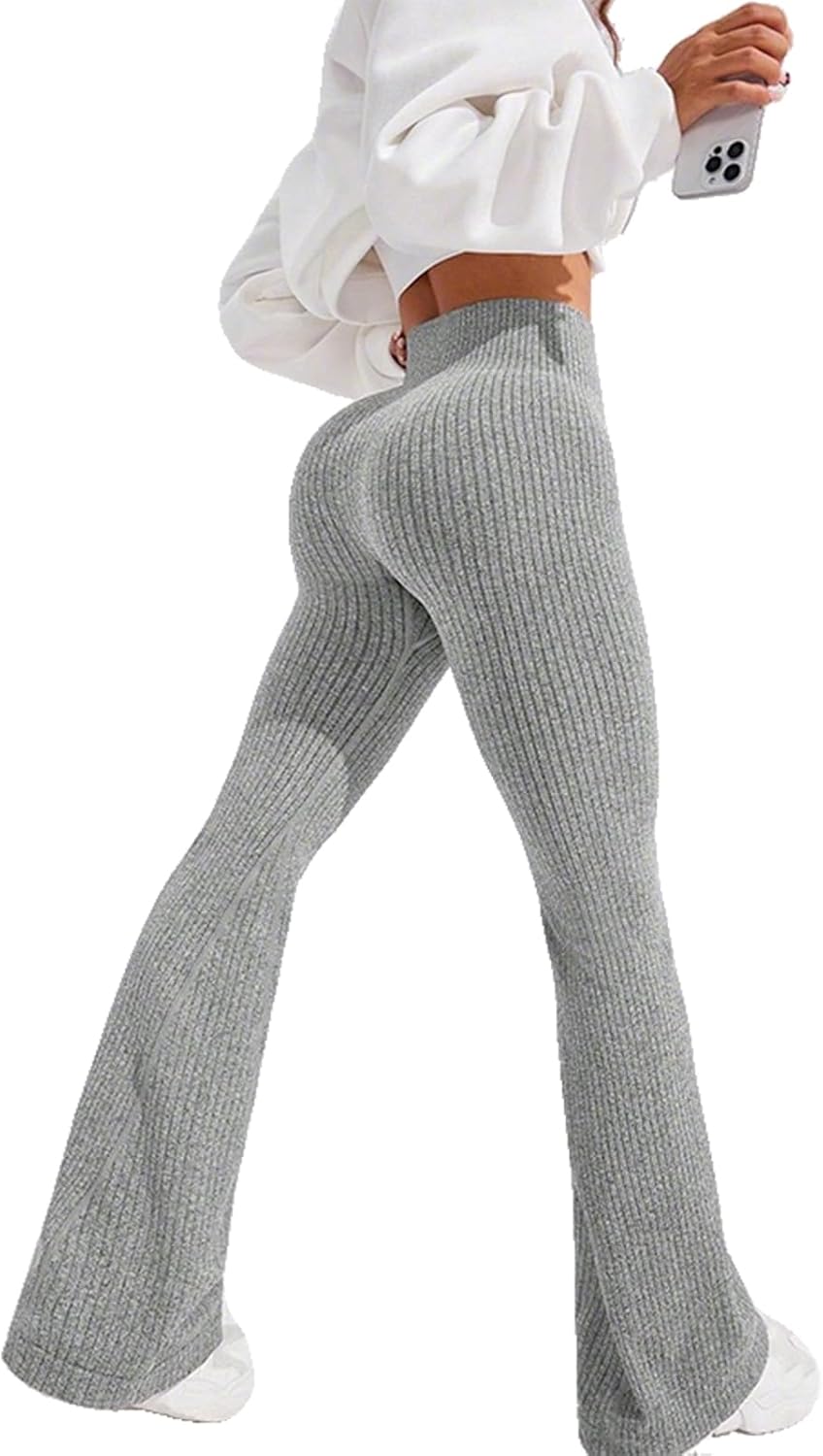These ribbed knit flare yoga leggings combine style and functionality for your active lifestyle. Designed with a high waist that provides tummy control, these workout pants offer a flattering silhouette while delivering the support you need during exercise or everyday wear. The ribbed knit fabric features a soft, stretchy texture that moves with your body, ensuring comfort whether you're flowing through yoga poses, hitting the gym, or running errands. The butt-lifting design enhances your natural curves for a confidence-boosting fit. The flared leg style adds a trendy, retro-inspired touch that sets these leggings apart from standard athletic wear, making them versatile enough to transition from workout to casual outings. The skinny fit through the hips and thighs combined with the flared bottom creates a balanced, elongating effect. Perfect for women seeking comfortable activewear that doesn't compromise on style, these leggings work beautifully for yoga, pilates, gym sessions, or as everyday athleisure wear.