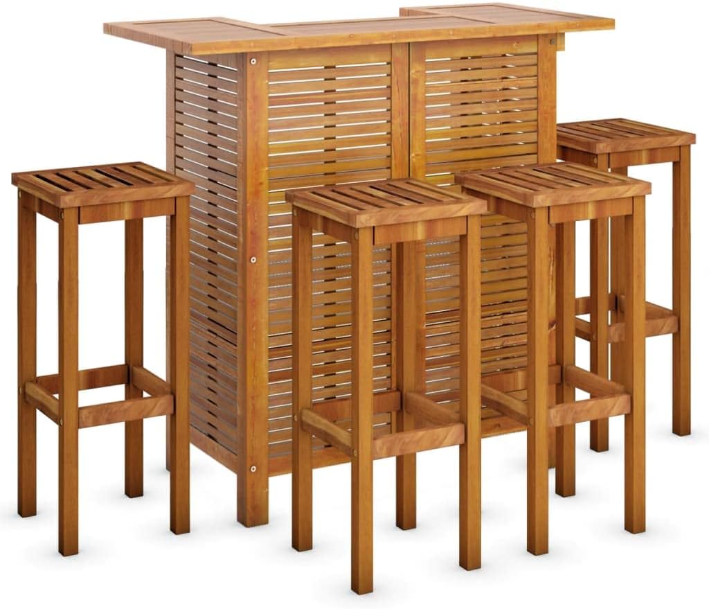 This wooden garden bar set has an elegant design and is meant to be the focal point of your garden, patio, or terrace.Solid acacia wood: Solid acacia wood is a beautiful natural material. Acacia wood is a tropical hardwood, which is dense, sturdy, and durable. Additionally, the oil-finished surface makes it easy to clean the garden table and chairs.Sturdy wooden frame: The wooden frames of the outdoor dining set ensure sturdiness and stability.Practical shelves: The bistro table has 2 shelves for keeping food and drinks within easy reach.Comfortable bar stools: The footrests of these wooden bar stools provide extra seating comfort.Timeless look: The sleek design of the wooden bistro table and stools make them a timeless investment for your home.Note:In order to extend the life of your outdoor furniture, we recommend you to clean it regularly and do not leave it outdoors without protection unnecessarily.Clean: Use a mild soap solution.Storing: If possible, store in a cool, dry place indoors. If the product is stored outdoors, protect it with a waterproof cover. Wipe and dry the excess water or snow from flat surfaces after a rain or snowfall. Allow sufficient air circulation to avoid moisture-related damage.Table:Material: Solid acacia wood with an oil finishOverall dimensions: 43.3" x 19.7" x 41.3" (L x W x H)Shelf size (each): 28.9" x 8.9" (W x D)Stool:Material: Solid acacia wood with an oil finishDimensions: 12" x 12" x 29.1" (W x D x H)Assembly required: YesDelivery contains:1 x Table4 x Stool