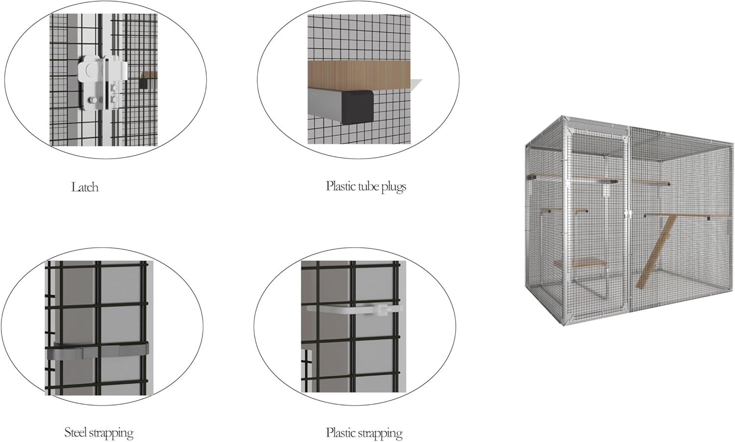 Product Name: 7.8ft X 4.9ft Large Cat Catio Playgroud ,Outside Cat Enclosure Playpen with 4 Platforms and Bridges,DIY Assembly for Outdoor,IndoorPlace of Origin:ChinaMain Color:SilverMain Material:MetalProduct DimensionsAssembled Length (in.):94.40Assembled Width (in.):59.00Assembled Height (in.):76.70Package SizeSub-item 1: Package Quantity: 139.01 * 16.94 * 2.36 in. 11.46 lbs.Sub-item 2: Package Quantity: 161.07 * 12.45 * 3.55 in. 33.06 lbs.Sub-item 3: Package Quantity: 181.16 * 10.24 * 9.46 in. 25.35 lbs.Sub-item 4: Package Quantity: 193.38 * 8.67 * 4.33 in. 80.45 lbs.Product Features【Plenty of Room】 Cat Playpen provides a large hangout area for your cat【Safe and Secure Mesh Construction】The enclosure is built with a strong, tightly woven mesh to provide optimal security. This mesh ensures that your pet stays safely inside while allowing for optimal ventilation.【Multi-platform】4 platforms allow cats to jump from left to right, giving cats more room to climb.【DIY】You can assemble the cat playpen freely,The panels we provide are enough to assemble a complete cat apartment,You can complete a satisfactory cat cage according to the different scenes and sizes in your own home.【Walk In Style】The 20.47-inch-wide front door with a security latch allows people to enter the cat house to interact with pets while making cleaning easier