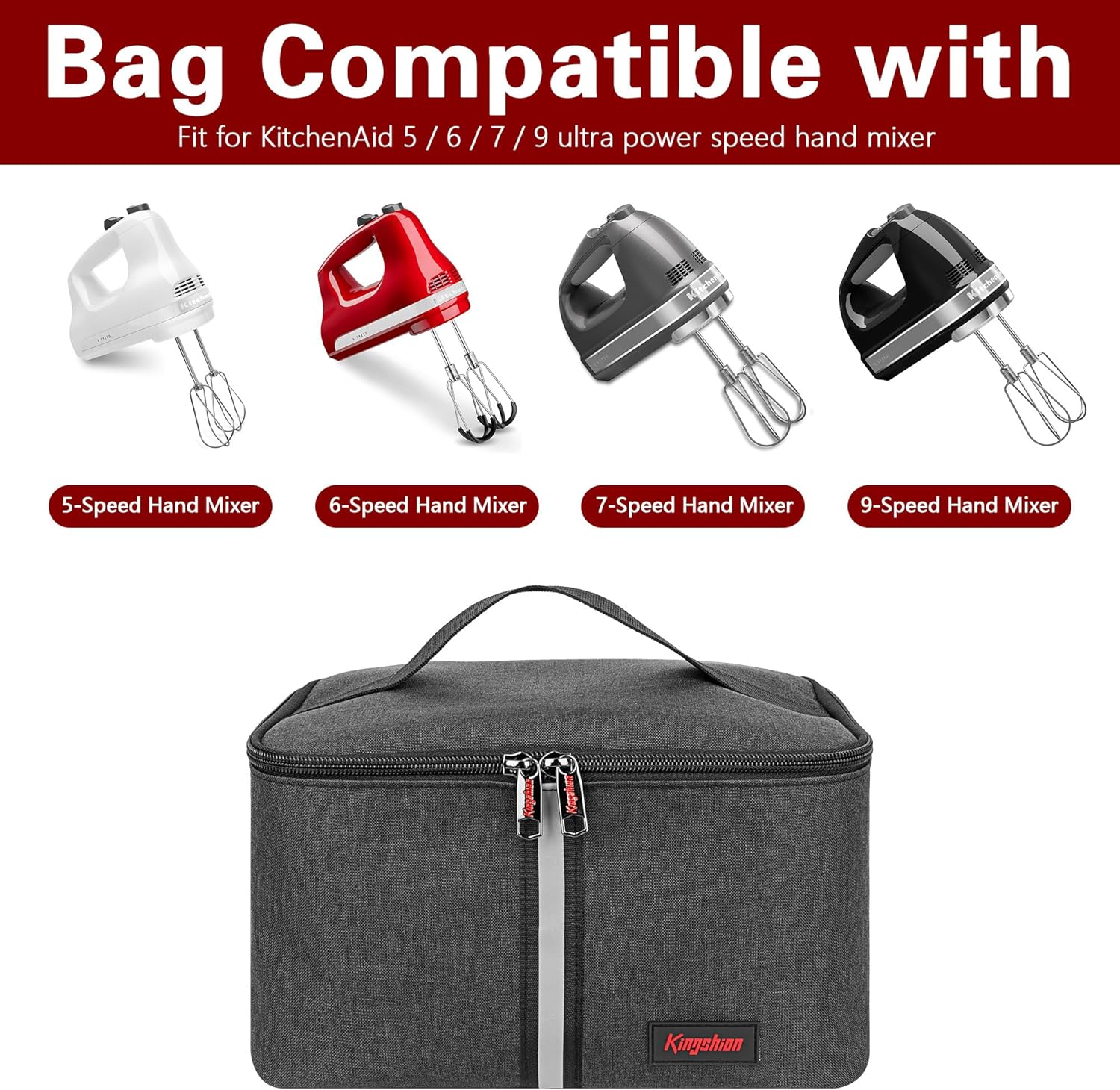 Compatibility: - Compatible with KitchenAid KHM512WH 5-Speed Ultra Power Hand Mixe - Compatible with KitchenAid 6 Speed Hand Mixer with Flex Edge Beaters - Compatible with KitchenAid 7-Speed Hand Mixer - Compatible with KitchenAid 9-Speed Digital Hand MixerSpecification: - Material: Polyester + 3mm pearl cotton - Dimensions (H x W x D): 24cm x 16.5cm x 16.5cm (9.5 x 6.5 x 6.5 inch) Note: -Carrying Bag Only, Hand Mixer is Not Included