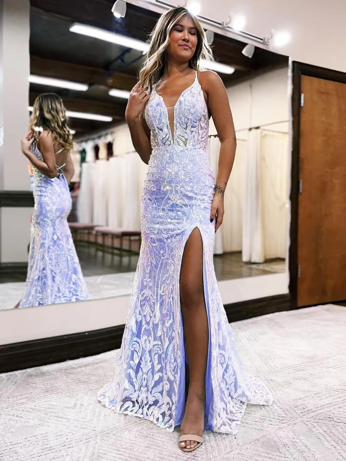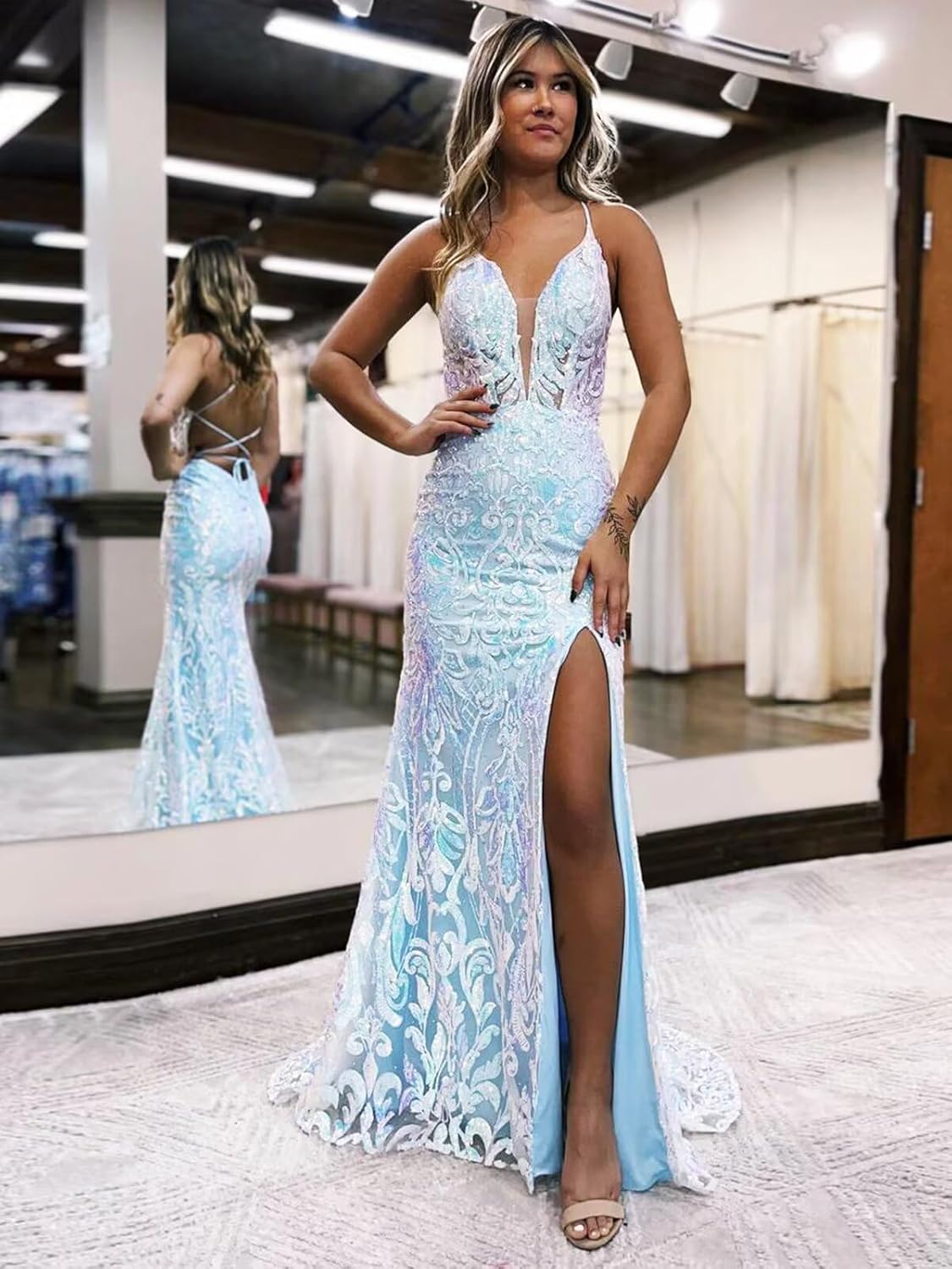 | Embellishment Feature | backless, mermaid, spaghetti straps, v neck, with slit |